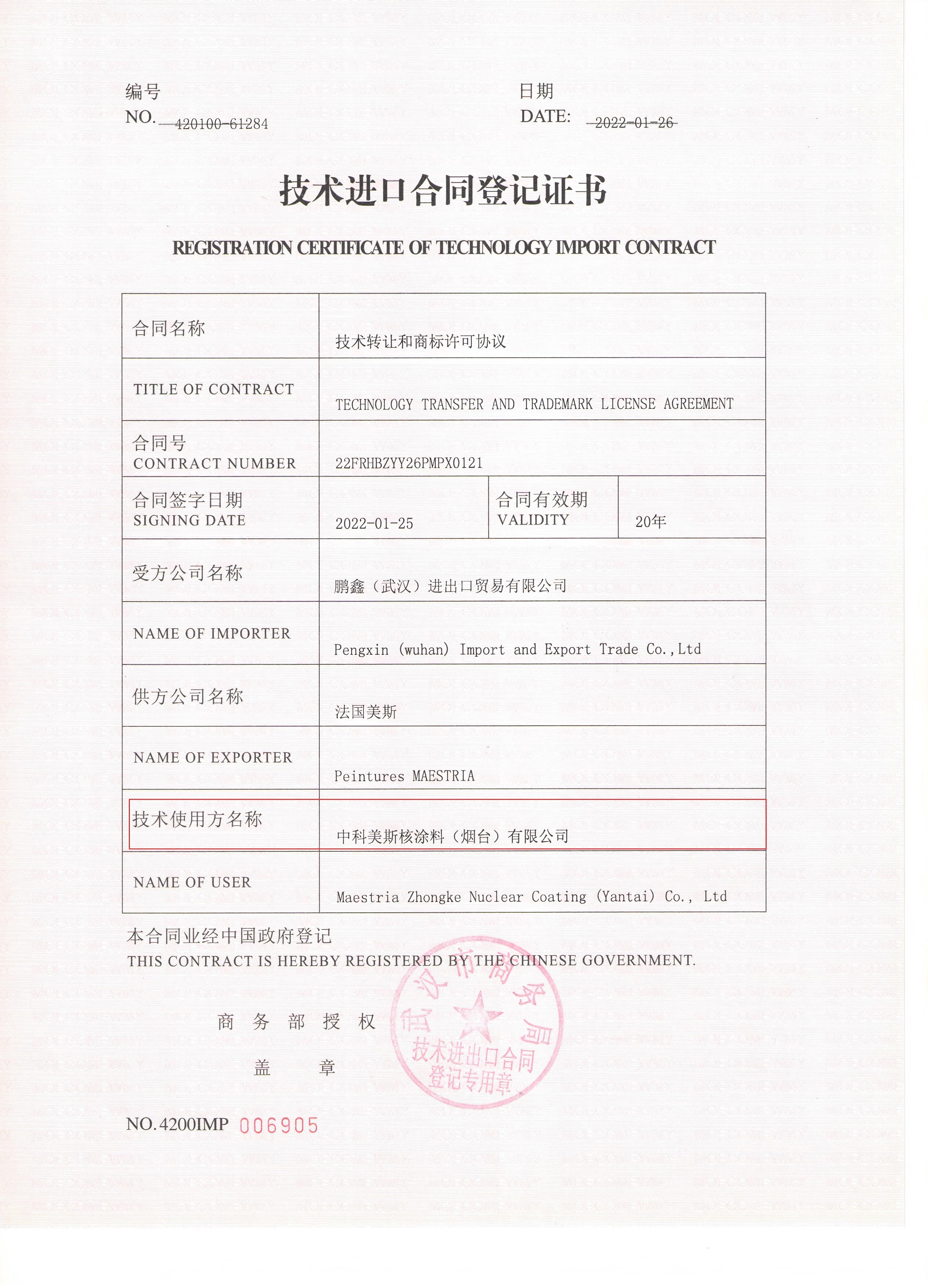 (技术进口合同登记证书 颁发部门:国家商务部)