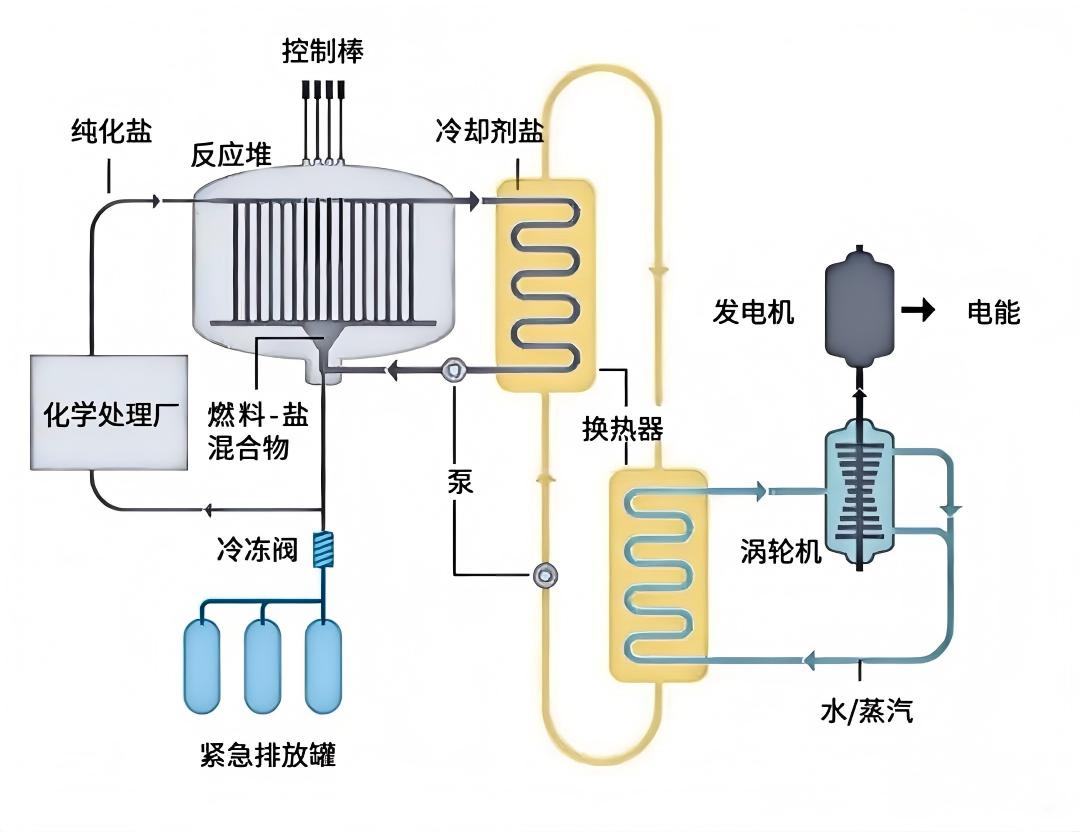 在技术实现上,钍基熔盐堆摒弃传统压水堆的固体燃料棒和水冷却剂,而是将核燃料直接溶解于高温熔融的氟化盐中,形成一体化的液态燃料。使反应堆在接近常压条件下运行,从根本上规避了高压爆炸风险。在能量转换路径上,携带核燃料的熔盐在堆芯发生裂变反应后,流经主换热器将热量传递给二回路,最终通过三回路的水或超临界二氧化碳推动汽轮机发电。其高达700℃的运行温度,不仅提升了发电效率,也为高温制氢、化工供热等非电应用开辟了广阔前景。