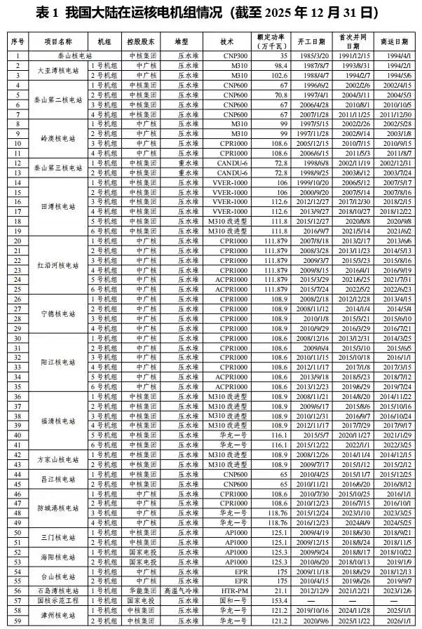 截至2025年12月31日,我国大陆在运核电机组达到59台,总装机容量为6225.894万千瓦。