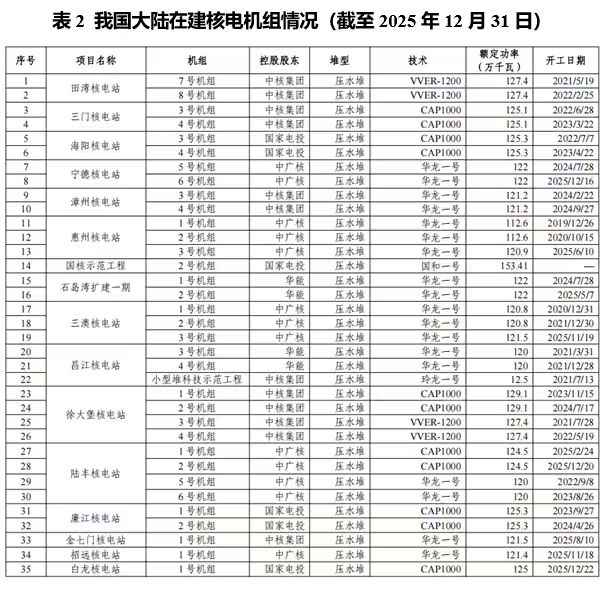 建设提速:2025年,全国共有9台新机组开工建设(完成核岛FCD),包括陆丰1号、石岛湾扩建2号、惠州3号等,彰显了行业强劲的推进力度。